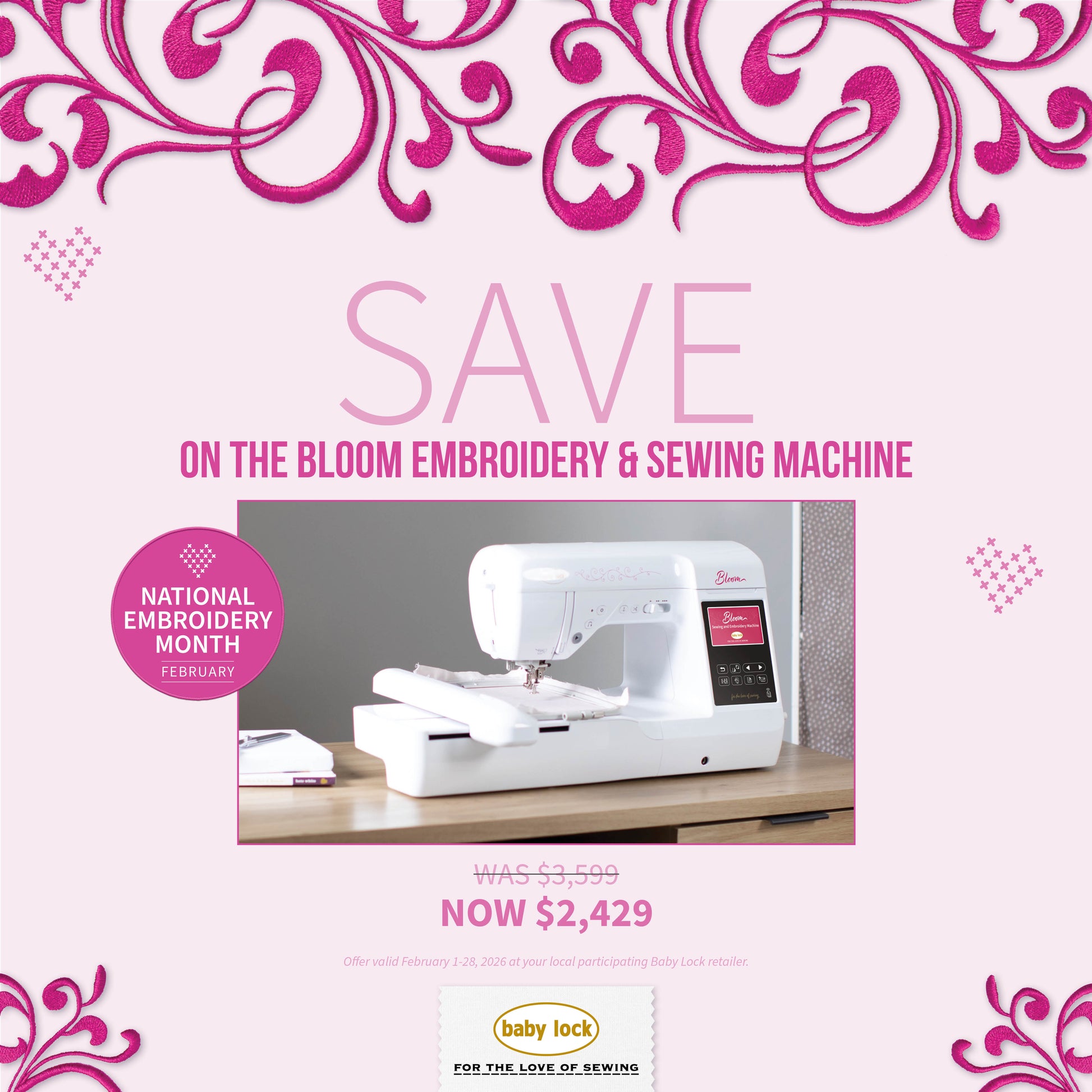 If you want to step up your creativity to include embroidery, the Baby Lock Bloom fits the bill. The Bloom delivers all the features you need including 342 built-in designs, 251 built-in stitches, convenient one-touch buttons, Design Database Transfer, and more. Move your sewing projects to the next level with the Bloom!